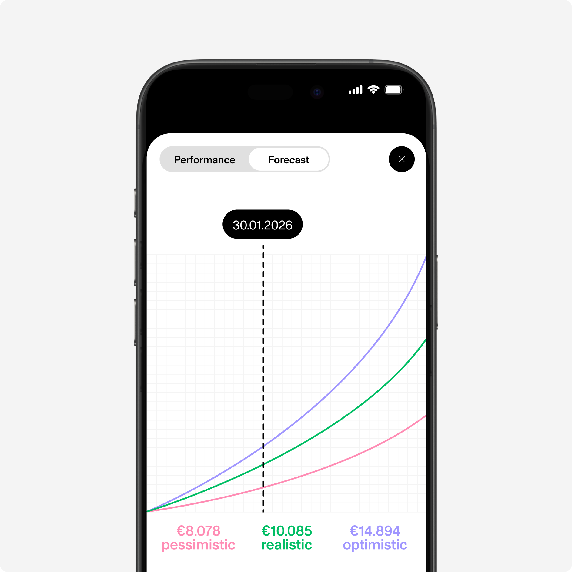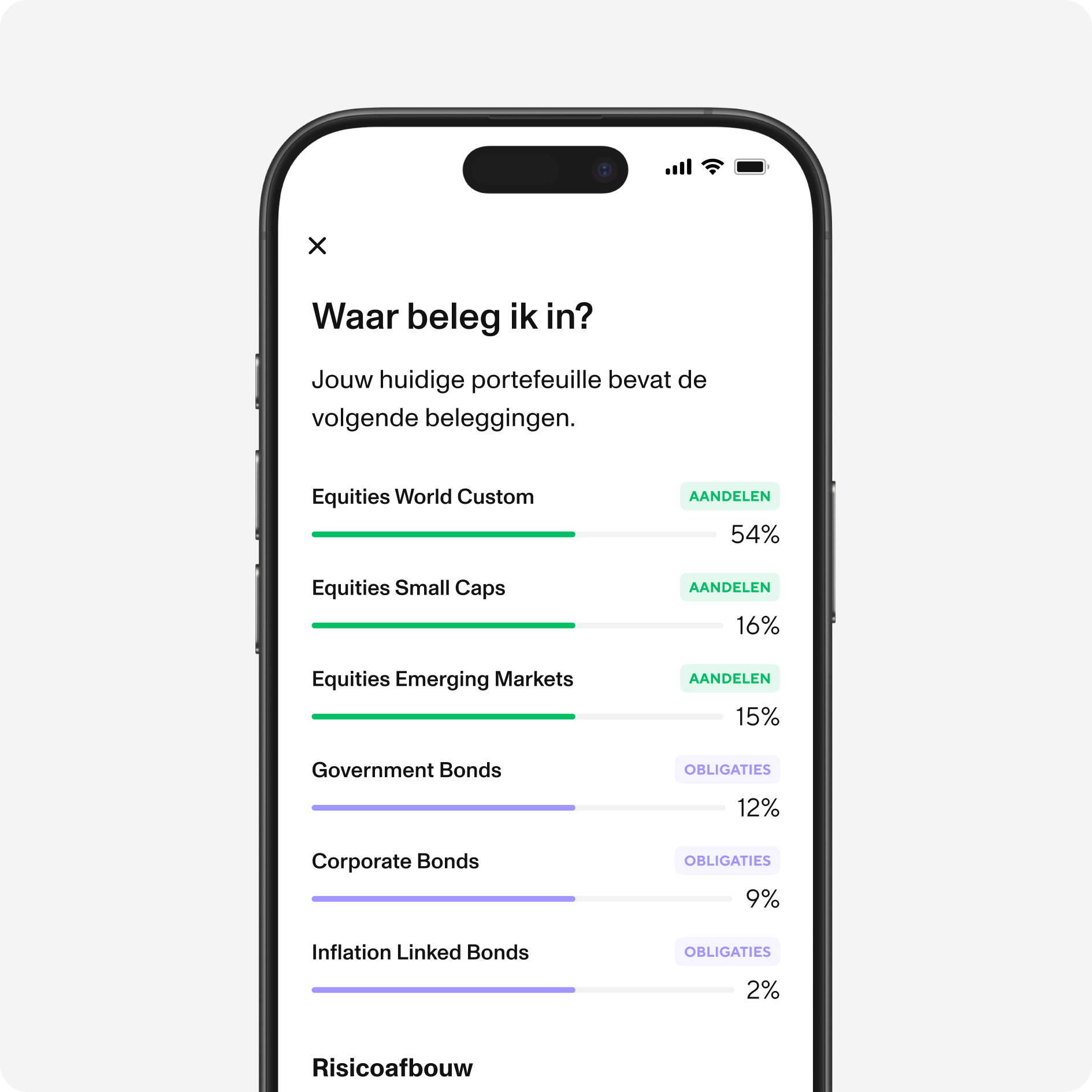 Met één simpele app houd je al je beleggingen overzichtelijk bij. Zie direct jouw totale inleg, de pensioenprognose op basis van jouw leven, je huidige én toekomstige stortingen, en beleg net zo makkelijk voor andere doelen.