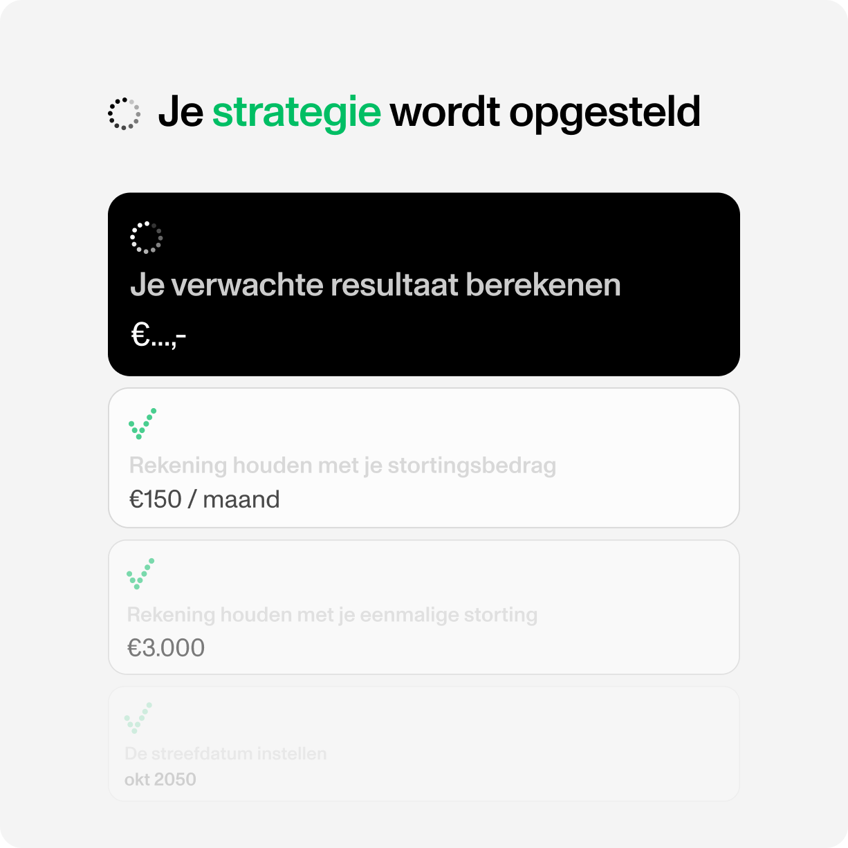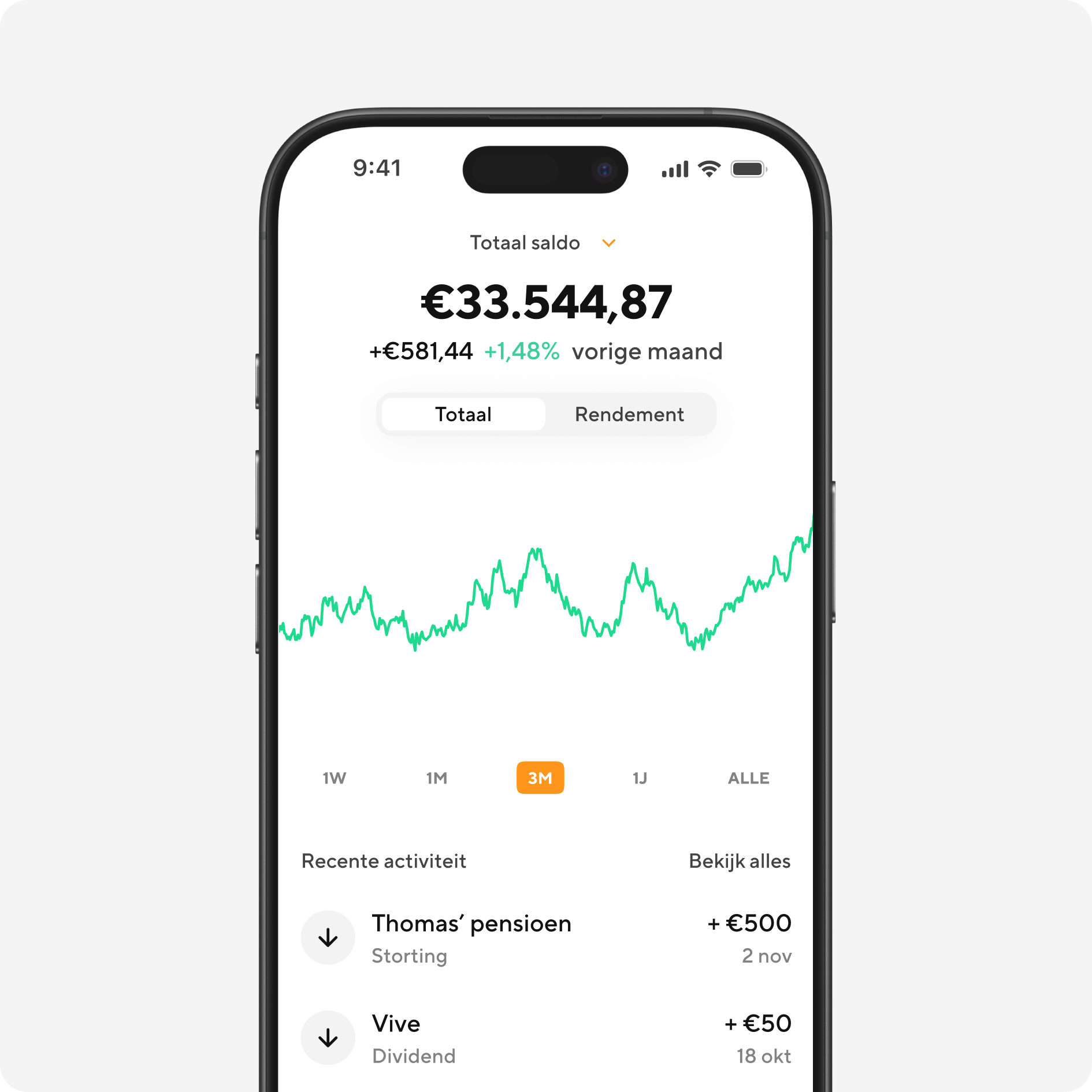 Met één blik zie je hoeveel je hebt opgebouwd, wat er maandelijks binnenkomt en waar je naartoe werkt. Alles realtime, altijd up-to-date.
